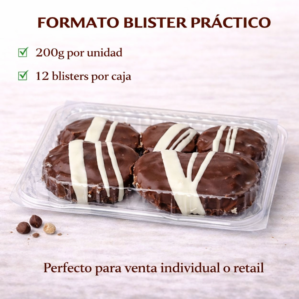 Blister transparente de 200 g, práctico y listo para consumo, que mantiene la frescura y protege el producto. Formato pack de 12 unidades, ideal tanto para consumo personal como para venta en tienda.