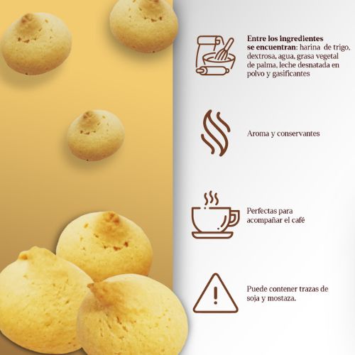 Harina de TRIGO, azúcar, aceites y grasas vegetales (palma), LECHE desnatada en polvo, dextrosa, emulgente (lecitina), gasificantes (bicarbonato sódico y amónico), sal y aroma. Puede contener trazas de huevos, soja y frutos de cáscara.