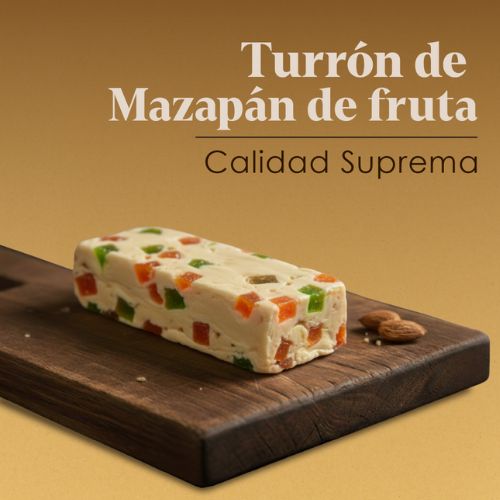 -TURRÓN MAZAPÁN FRUTA: Mazapán (77%): (ALMENDRAS (45%), azúcar, jarabe de glucosa y fructosa, conservantes invertasa (E1103, E200 y E202)). Relleno de fruta confitada (23%): (calabazate, azúcar, jarabe de glucosa y fructosa, acidulante (E330), conservadores (E202 y E223) y colorantes E-100, E120 y E133)). Puede contener trazas de gluten, huevo, soja, leche, frutos de cáscara, cacahuete y sésamo.
