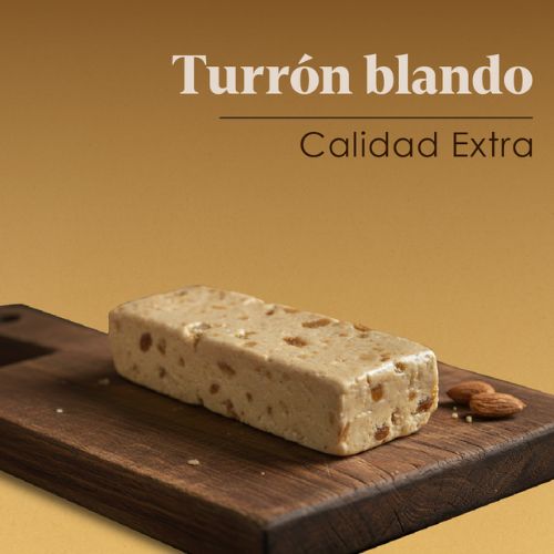 -TURRÓN BLANDO ALMENDRA: ALMENDRAS (50%), azúcar, jarabe de glucosa y fructosa, miel, estabilizante E-471 y clara de HUEVO. Puede contener trazas de soja, leche, frutos de cáscara, cacahuetes, sésamo, sulfitos.