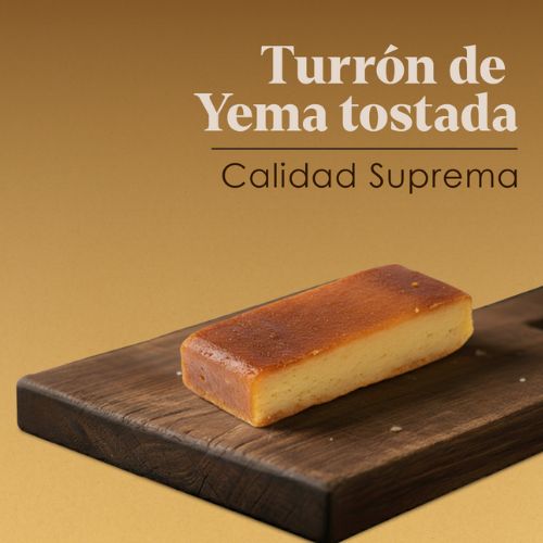 -TURRÓN YEMA TOSTADA: ALMENDRAS (40%), azúcar, yema de HUEVO confitada 17% (yema de HUEVO, azúcar, glucosa, conservante: ácido sórbico), jarabe de glucosa y fructosa, conservante (invertasa (E-1103)) esencia y conservantes (ácido sórbico (E-200) y sorbato potásico (E-202)). Puede contener trazas de otros frutos de cáscara, cacahuetes, sésamo, leche, soja, gluten y sulfitos.