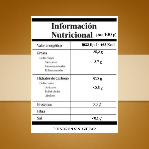 ELABORACIÓN | Estos polvorones vienen en piezas de 30 gramos y están aderezado con almendras y maltitol. Su olor y textura es el característico en polvorones y mantecados. Este dulce navideño tiene un color de masa horneada y maltitol en la capa de arriba. Gran sabor a almendra.
