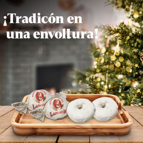 ELABORACIÓN | Rosco de pasta elaborada con manteca de cerdo y vino dulce de la comarca malagueña, el cual le da el sabor típico de este producto navideño, emborriza da en azúcar tamizada y con el sabor que le dan su contenido de especias y frutos secos tales como la matalahúga, el ajonjolí y la almendra. Liado en papel seda con moños
